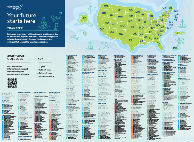 The national Common App map is a useful college exploration tool for helping students explore all of the incredible college options available to them. This version of the map is specifically designed for those who work with transfer students. It only shows colleges that accept Common App for transfer. Map size is 27.75” x 20.25”.
